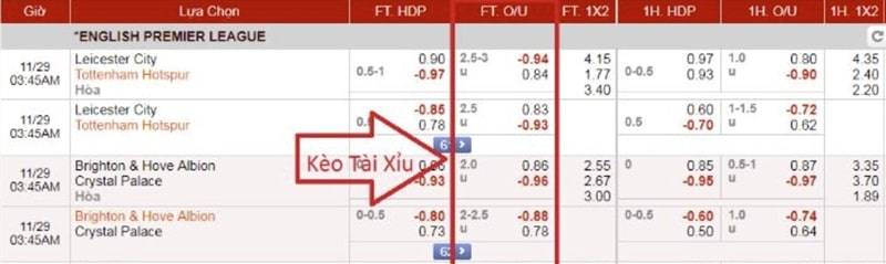 Kèo tài xỉu trong bảng tỷ lệ kèo nhà cái